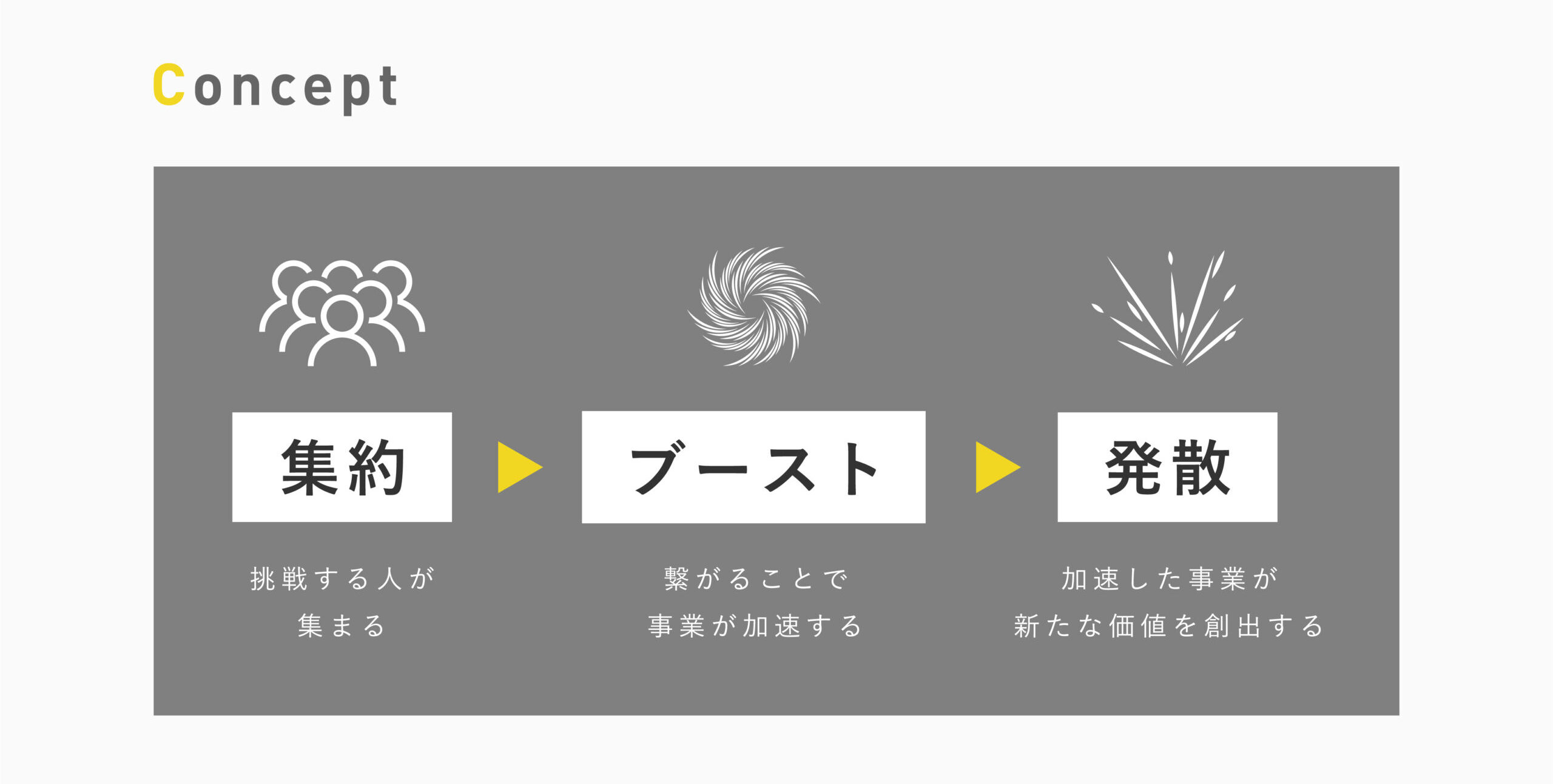 COBACCOが目指すのは、人が集まり価値が『集約』され、つながりによって事業や挑戦が『ブースト』され、加速した価値が地域社会へと『発散』されていく循環。